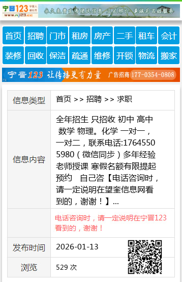 全年招生 只招收 初中 高中 数学 物理。化学 一对一,一对二,联系电话:17645505980(微信同步)多年经验老师授课 寒假名额有限提起预约 自己咨 【电话咨询时,请一定说明在望奎信息网看到的,谢谢!】 |