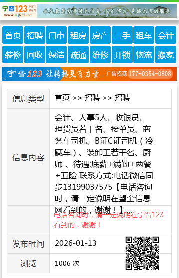 会计、人事5人、收银员、理货员若干名、接单员、商务车司机、B证C证司机(冷藏车)、装卸工若干名、厨师 、待遇:底薪+满勤+两餐+五险 联系方式:电话微信同步13199037575