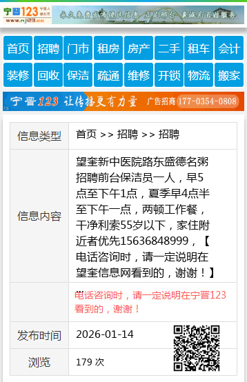 望奎新中医院路东盛德名粥招聘前台保洁员一人,早5点至下午1点,夏季早4点半至下午一点,两顿工作餐,干净利索55岁以下,家住附近者优先15636848999,