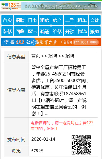 望奎全屋定制工厂招聘男工,年龄25-45岁之间有经验者优,工资3500-5000之间,待遇优厚,长年活保11个月活,有意者联系18745896111