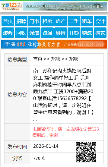 南二孙和记肉夹馍招聘后厨女工 操作简单好上手 手脚麻利就能干时间早八点半到晚九点半 工资3200+满勤200 联系电话15636578292