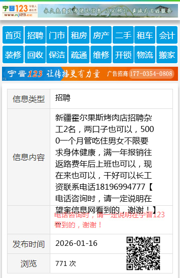 新疆霍尔果斯烤肉店招聘杂工2名,两口子也可以,5000一个月管吃住男女不限要求身体健康,满一年报销往返路费年后上班也可以,现在来也可以,干好可以长工资联系电话18196994777 【电话咨询时,请一定说明在望奎信息网看到的,谢谢!】 |