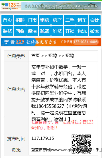 常年专补初中数学,一对一或一对二,小班四名。本人亲自带,价格优惠。本人有十多年教学辅导经验,带过多届初四毕业班学生,有想提升数学成绩的同学请联系我18645558627 【电话咨询时,请一定说明在望奎信息网看到的,谢谢!】 |