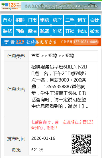 招聘服务员早班6️⃣点下2️⃣点一名,下午2️⃣点到晚?点一名,月薪3000+200满勤,☎13555358887微信同步,学生工短期工勿扰