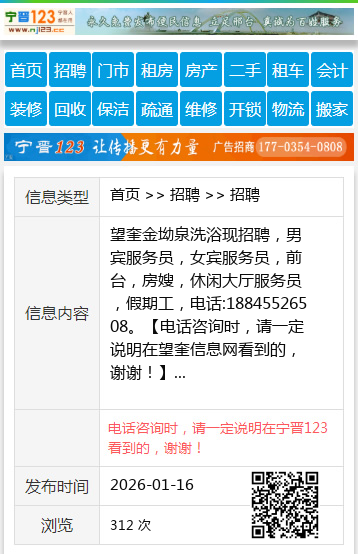 望奎金坳泉洗浴现招聘,男宾服务员,女宾服务员,前台,房嫂,休闲大厅服务员,假期工,电话:18845526508。