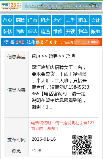 双汇冷鲜肉招聘女工一名,要求会卖货,干活干净利落,半天班,全天班,只招长期合作,短期勿扰15845533365