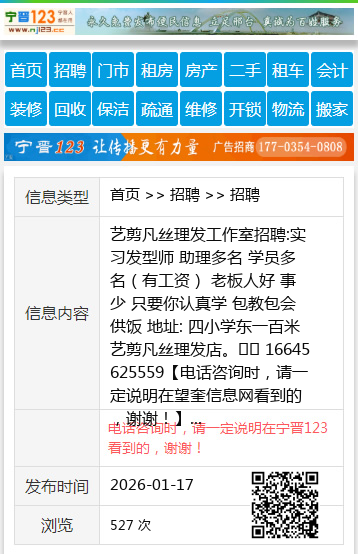 艺剪凡丝理发工作室招聘:实习发型师 助理多名 学员多名(有工资) 老板人好 事少 只要你认真学 包教包会 供饭 地址: 四小学东一百米 艺剪凡丝理发店。☎️ 16645625559