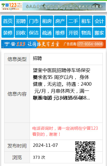 望奎中医院招聘停车场保安员一名! 要求:55 周岁以内, 身体健康,无劣迹。待遇:2400 元/月,月串休两天,满一年涨 100 元,连涨 5 年 联系电话:18645565688
