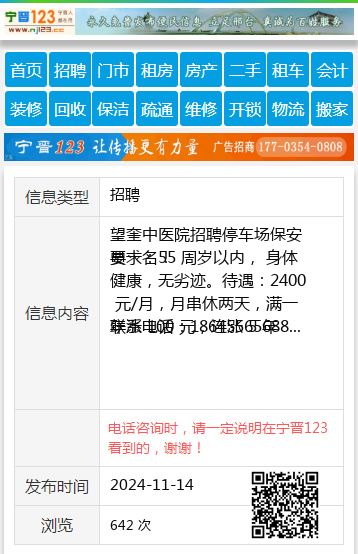 望奎中医院招聘停车场保安员一名! 要求:55 周岁以内, 身体健康,无劣迹。待遇:2400 元/月,月串休两天,满一年涨 100 元,连涨 5 年 联系电话:18645565688