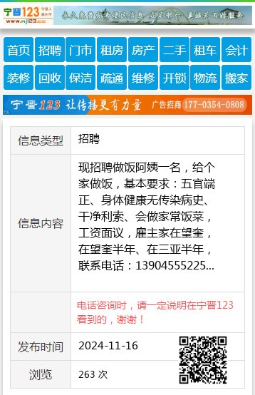 招聘:做饭阿姨、打扫卫生,要求干净利落、做饭好吃、有责任心、健康无传染病史、工资:2600/月、要求 50 岁以下,联系电话:18917915678