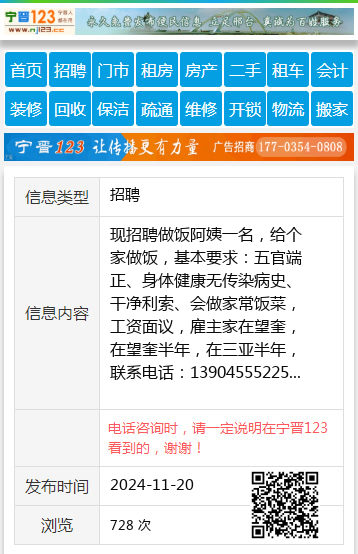 现招聘做饭阿姨一名,给个家做饭,基本要求:五官端正、身体健康无传染病史、干净利索、会做家常饭菜,工资面议,雇主家在望奎,在望奎半年,在三亚半年,联系电话:13904555225