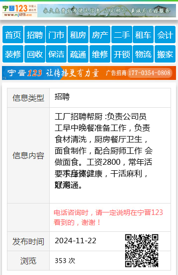 工厂招聘帮厨 :负责公司员工早中晚餐准备工作,负责食材清洗,厨房餐厅卫生,面食制作,配合厨师工作 会做面食。工资2800,常年活,不压资。 要求身体健康,干活麻利, 好沟通。 联系