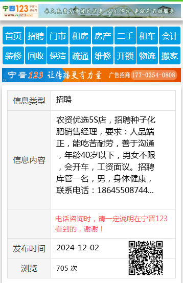 农资优选5S店,招聘种子化肥销售经理,要求:人品端正,能吃苦耐劳,善于沟通,年龄40岁以下,男女不限,会开车,工资面议。招聘库管一名,男,身体健康,联系电话:18645508744