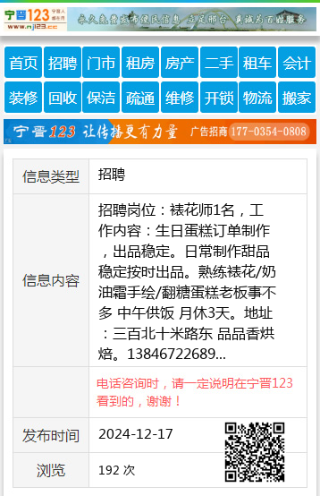 招聘岗位:裱花师1名, 工作内容:生日蛋糕订单制作,出品稳定。日常制作甜品稳定按时出品。熟练裱花/奶油霜手绘/翻糖蛋糕 老板事不多 中午供饭 月休3天。 地址:三百北十米路东 品品香烘焙。 13846722689
