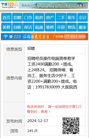 招聘吧员操作电脑简单易学 工资2400满勤200 +提成。上24休24。 招聘房嫂、看池工、服务生活少好干,工资2200+满勤200+提成。电话:19917830099 大医院西 【电话咨询时,请一定说明在望奎信息网看到的,谢谢!】 |