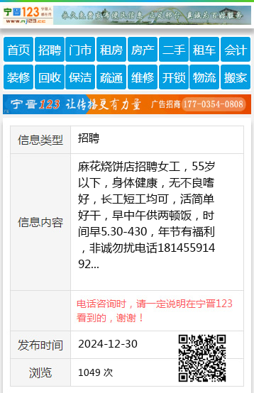 麻花烧饼店招聘女工,55岁以下,身体健康,无不良嗜好,长工短工均可,活简单好干,早中午供两顿饭,时间早5.30-430,年节有福利,非诚勿扰电话18145591492