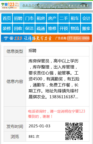 库房保管员,高中以上学历,库存整理,出入库管理,要求责任心强,能管事。工资4500,有满勤奖,有五险,通勤车,免费工作餐,长期工作。地址先锋镇先锋村晨骐农业。13836116187
