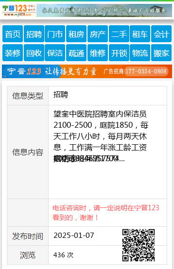 望奎中医院招聘室内保洁员2100-2500,庭院1850,每天工作八小时,每月两天休息,工作满一年涨工龄工资100元 招中晚班保洁1700 电话:18846957574