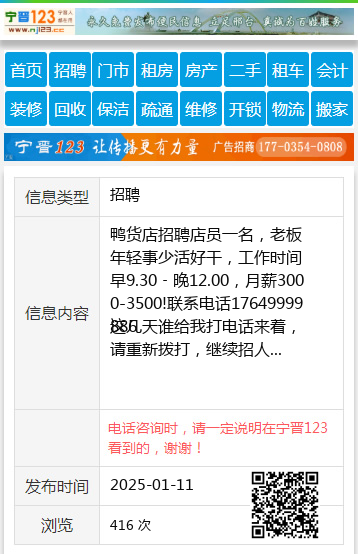 鸭货店招聘店员一名,老板年轻事少活好干,工作时间 早9.30﹣晚12.00,月薪3000-3500!联系电话17649999886 这几天谁给我打电话来着,请重新拨打,继续招人