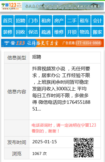 抖音视频发小说 ,无任何要求,居家办公 工作经验不限,上班族闲余时间皆可稳定发剧月收入3000以上 平均每日工作时间不限,多做多得 微信电话同步17645518851 【电话咨询时,请一定说明在望奎信息网看到的,谢谢!】 |