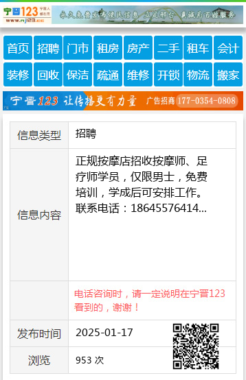 正规按摩店招收按摩师、足疗师学员,仅限男士,免费培训,学成后可安排工作。联系电话:18645576414