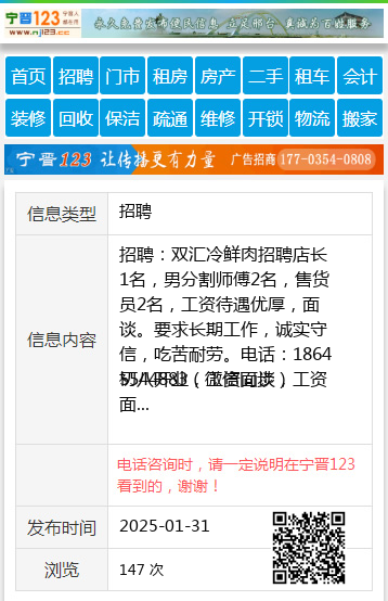 招聘:双汇冷鲜肉招聘店长1名,男分割师傅2名,售货员2名,工资待遇优厚,面谈。要求长期工作,诚实守信,吃苦耐劳。电话:18645544883(微信同步)