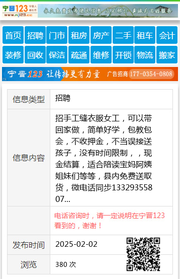 招手工缝衣服女工,可以带回家做,简单好学,包教包会,不收押金,不当误接送孩子,没有时间限制,,现金结算,适合陪读宝妈阿姨姐妹们等等,县内免费送取货,微电话同步13329355807 【电话咨询时,请一定说明在望奎信息网看到的,谢谢!】 |