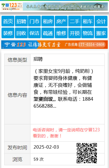 (家里女宝9月龄,纯奶粉)要求育婴师身体健康,有健康证,无不良嗜好,会做辅食,有带娃经验,可长期在望奎白班。