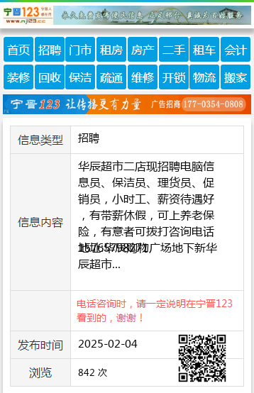 华辰超市二店现招聘电脑信息员、保洁员、理货员、促销员,小时工、薪资待遇好,有带薪休假,可上养老保险,有意者可拨打咨询电话15765798271