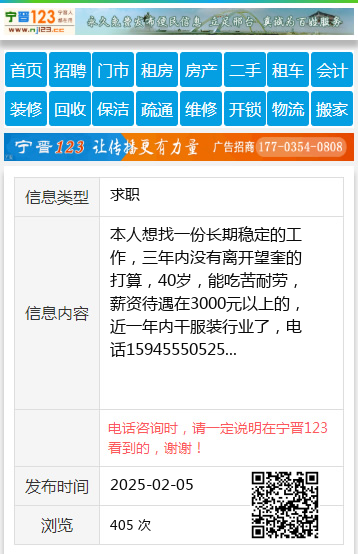 本人想找一份长期稳定的工作,三年内没有离开望奎的打算,40岁,能吃苦耐劳,薪资待遇在3000元以上的,近一年内干服装行业了,电话15945550525