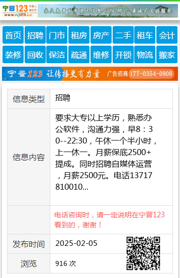 要求大专以上学历,熟悉办公软件,沟通力强,早8:30--22:30,午休一个半小时,上一休一。月薪保底2500+提成。同时招聘自媒体运营,月薪2500元。电话13717810010 【电话咨询时,请一定说明在望奎信息网看到的,谢谢!】 |