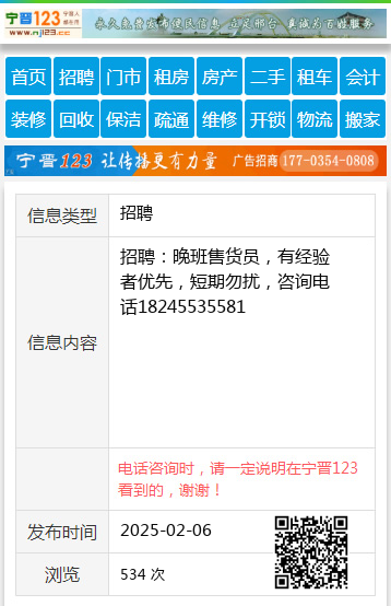招聘:晚班售货员,有经验者优先,短期勿扰,咨询电话18245535581