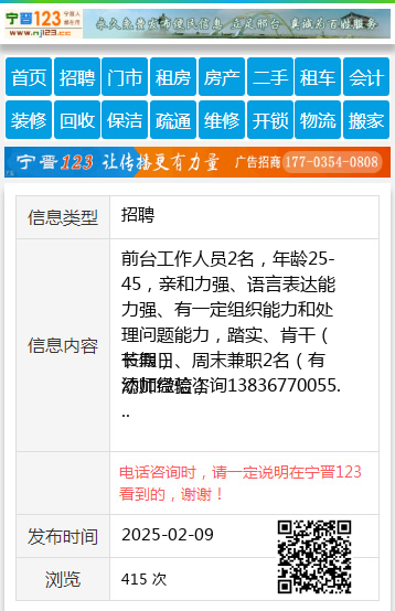 前台工作人员2名,年龄25-45,亲和力强、语言表达能力强、有一定组织能力和处理问题能力,踏实、肯干(长期)