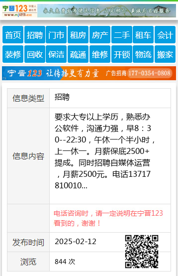 要求大专以上学历,熟悉办公软件,沟通力强,早8:30--22:30,午休一个半小时,上一休一。月薪保底2500+提成。同时招聘自媒体运营,月薪2500元。电话13717810010 【电话咨询时,请一定说明在望奎信息网看到的,谢谢!】 |