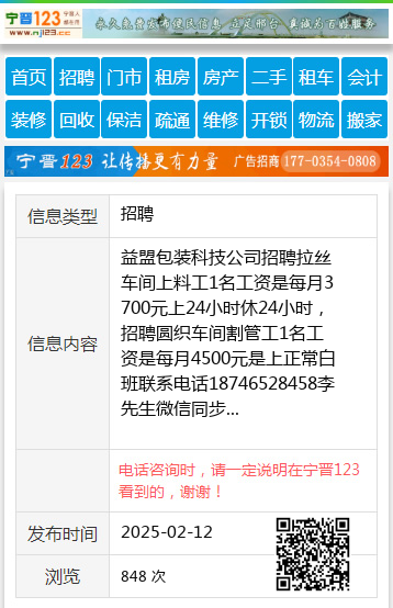 益盟包装科技公司招聘拉丝车间上料工1名工资是每月3700元上24小时休24小时,招聘圆织车间割管工1名工资是每月4500元是上正常白班联系电话18746528458李先生微信同步 【电话咨询时,请一定说明在望奎信息网看到的,谢谢!】 |