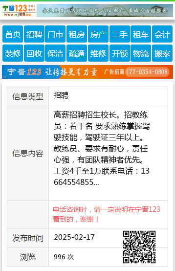 高薪招聘招生校长。招教练员:若干名 要求熟练掌握驾驶技能,驾驶证三年以上。教练员、要求有耐心,责任心强,有团队精神者优先。工资4千至1万联系电话:13664554855 【电话咨询时,请一定说明在望奎信息网看到的,谢谢!】 |