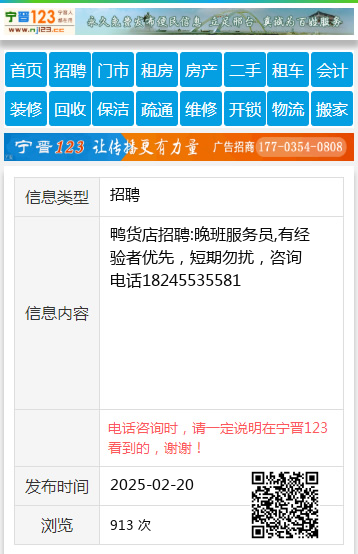 鸭货店招聘:晚班服务员,有经验者优先,短期勿扰,咨询电话18245535581