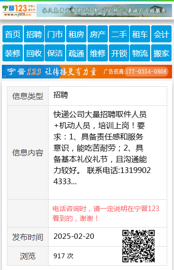 快递公司大量招聘取件人员+机动人员,培训上岗!要求:1、具备责任感和服务意识,能吃苦耐劳;2、具备基本礼仪礼节,且沟通能力较好。 联系电话:13199024333 【电话咨询时,请一定说明在望奎信息网看到的,谢谢!】 |