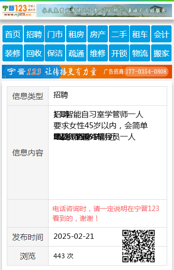 招聘 1 智能自习室学管师一人要求女性45岁以内,会简单电脑 2 小学课外辅导员一人 工资面谈 地址:四小学附近 15246556615