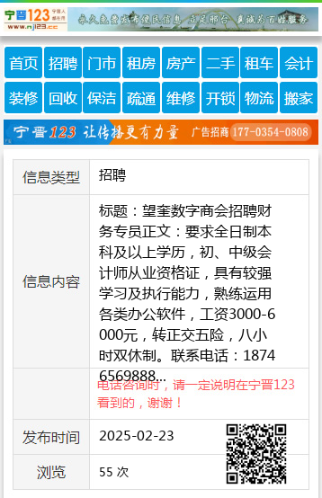 | 防骗提醒: | 望奎信息网(www.wangkui.cc)提醒您:手工活、网络兼职、刷单,都是骗子!凡以各种名义收取费用的都是骗子!找工作是往兜里挣钱,让你往外掏钱的都是骗子!异地招聘请提高警惕,谨防诈骗! |