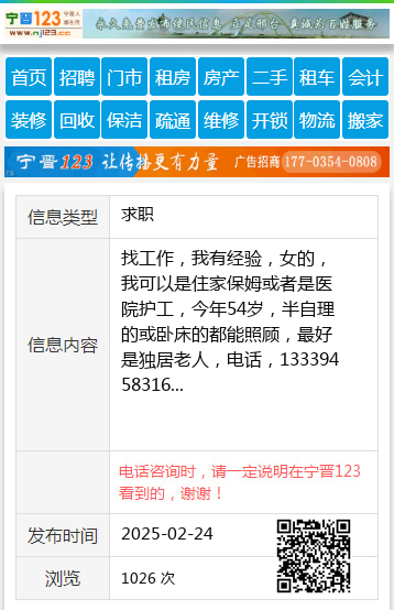 找工作,我有经验,女的,我可以是住家保姆或者是医院护工,今年54岁,半自理的或卧床的都能照顾,最好是独居老人,电话,13339458316 【电话咨询时,请一定说明在望奎信息网看到的,谢谢!】 |