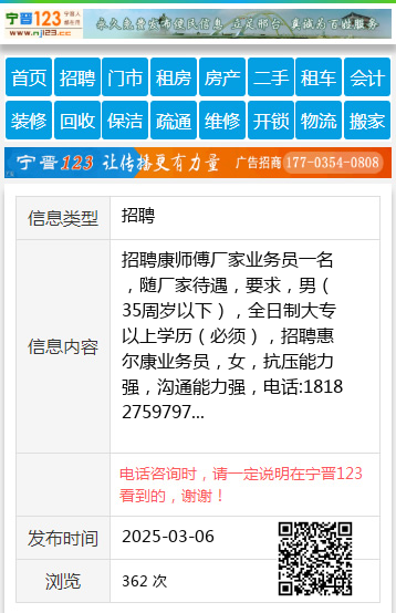 招聘康师傅厂家业务员一名,随厂家待遇,要求,男(35周岁以下),全日制大专以上学历(必须),招聘惠尔康业务员,女,抗压能力强,沟通能力强,电话:18182759797 【电话咨询时,请一定说明在望奎信息网看到的,谢谢!】 |