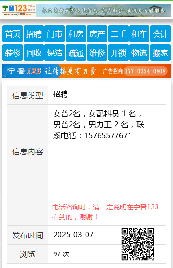 女普2名,女配料员 1 名,男普2名,男力工 2 名,联系电话:15765577671