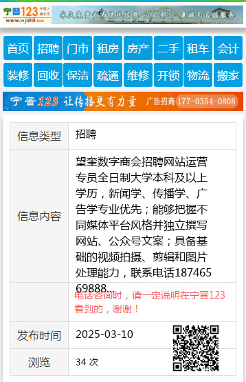 全日制大学本科及以上学历,新闻学、传播学、广告学专业优先;能够把握不同媒体平台风格并独立撰写网站、公众号文案;具备基础的视频拍摄、剪辑和图片处理能力,联系电话18746569888 【电话咨询时,请一定说明在望奎信息网看到的,谢谢!】 |