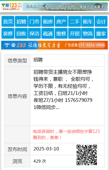 招聘带货主播男女不限想挣钱得来,兼职 , 全职均可,学历不限,有无经验均可,工资日结,白班21/1小时 夜班27/1小时 15765790791微信同步 【电话咨询时,请一定说明在望奎信息网看到的,谢谢!】 |