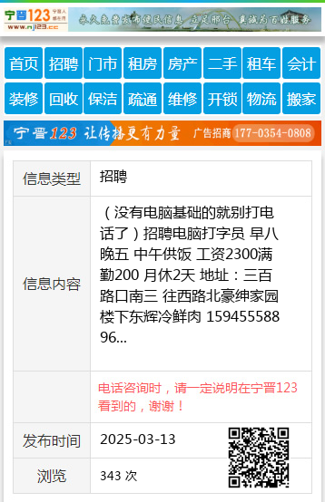 (没有电脑基础的就别打电话了)招聘电脑打字员 早八晚五 中午供饭 工资2300满勤200 月休2天 地址:三百路口南三 往西路北豪绅家园楼下东辉冷鲜肉 15945558896 【电话咨询时,请一定说明在望奎信息网看到的,谢谢!】 |