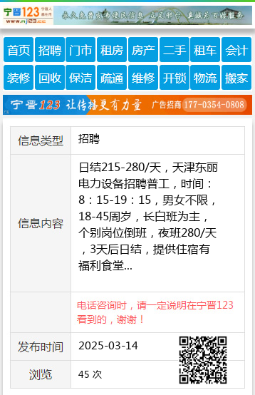日结215-280/天,天津东丽电力设备招聘普工,时间:8:15-19:15,男女不限,18-45周岁,长白班为主,个别岗位倒班,夜班280/天,3天后日结,提供住宿有福利食堂 【电话咨询时,请一定说明在望奎信息网看到的,谢谢!】 |