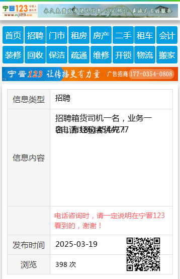 招聘箱货司机一名,业务一名,有经验者优先! 电话:18614544777