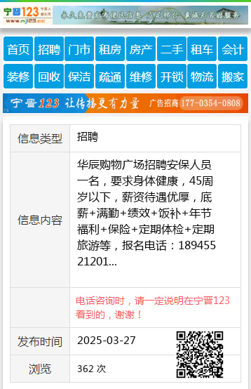 华辰购物广场招聘安保人员一名,要求身体健康,45周岁以下,薪资待遇优厚,底薪+满勤+绩效+饭补+年节福利+保险+定期体检+定期旅游等,报名电话:18945521201 【电话咨询时,请一定说明在望奎信息网看到的,谢谢!】 |