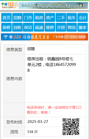 楼房出租:明鑫园8号楼七单元2楼,电话18645720998